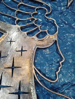 Из глубины формы постепенно проступает лик Крылатой Богини — не женщина, не ангел, а сущность, соединяющая небеса и материю. Её взгляд — как граница между тьмой и рассветом. А вместо короны — крылья. Они не украшают, а возносят к небесам. Символ свободы, рождающийся из осознания собственной силы.